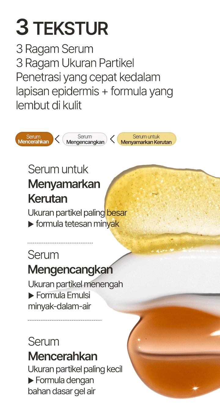 Kombinasi dari 3 jenis serum. Membuka rahasia dari kekuatan yang lebih dari anti-aging.